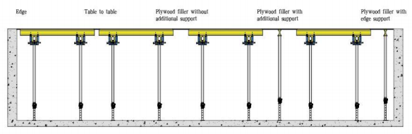 Чтобы перекрыть значительное расстояние между комплектами традиционной опалубки стола, можно использовать фанерные вставки. Для крепления фанерного заполнения к стальной опоре, состоящей из деревянной балки H20, не нужны головки стола или четырехсторонние головки. Кроме того, если дополнительную опалубку стола невозможно разместить у края перекрытия, необходимо использовать опорные балки из древесины Н20 и фанеры в сочетании со стальным анкером.