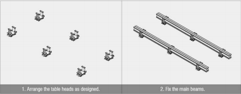 • Установите стальные стойки: прикрепите стальные стойки к головкам стола и закрепите их на месте с помощью соответствующих крепежных элементов.